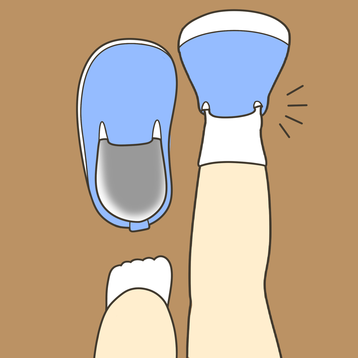 靴を奥まで入れた後、かかとを指で引っ張る動作は、手指の巧緻性や力加減、足の位置の感覚を同時に使う複雑な動作です。このステップを視覚的に確認できるイラストを用いることで、子どもたちは「どうやって引っ張ればよいか」を理解しやすくなり、自分で靴を履く動作を完成させる手助けになります。初めは大人がそばで「ここを引っ張ると入るよ」と声かけをしながら練習すると、安心して取り組むことができます。