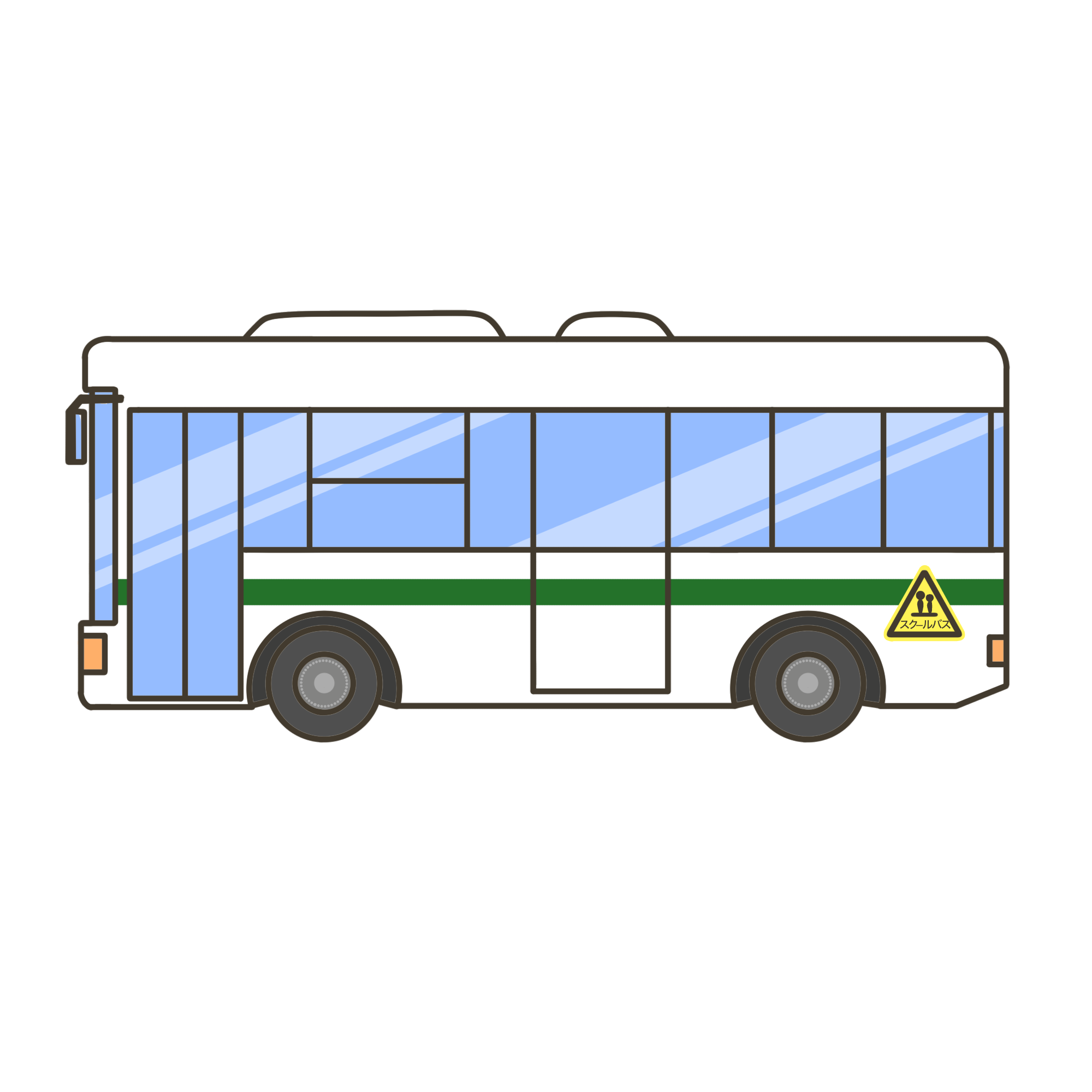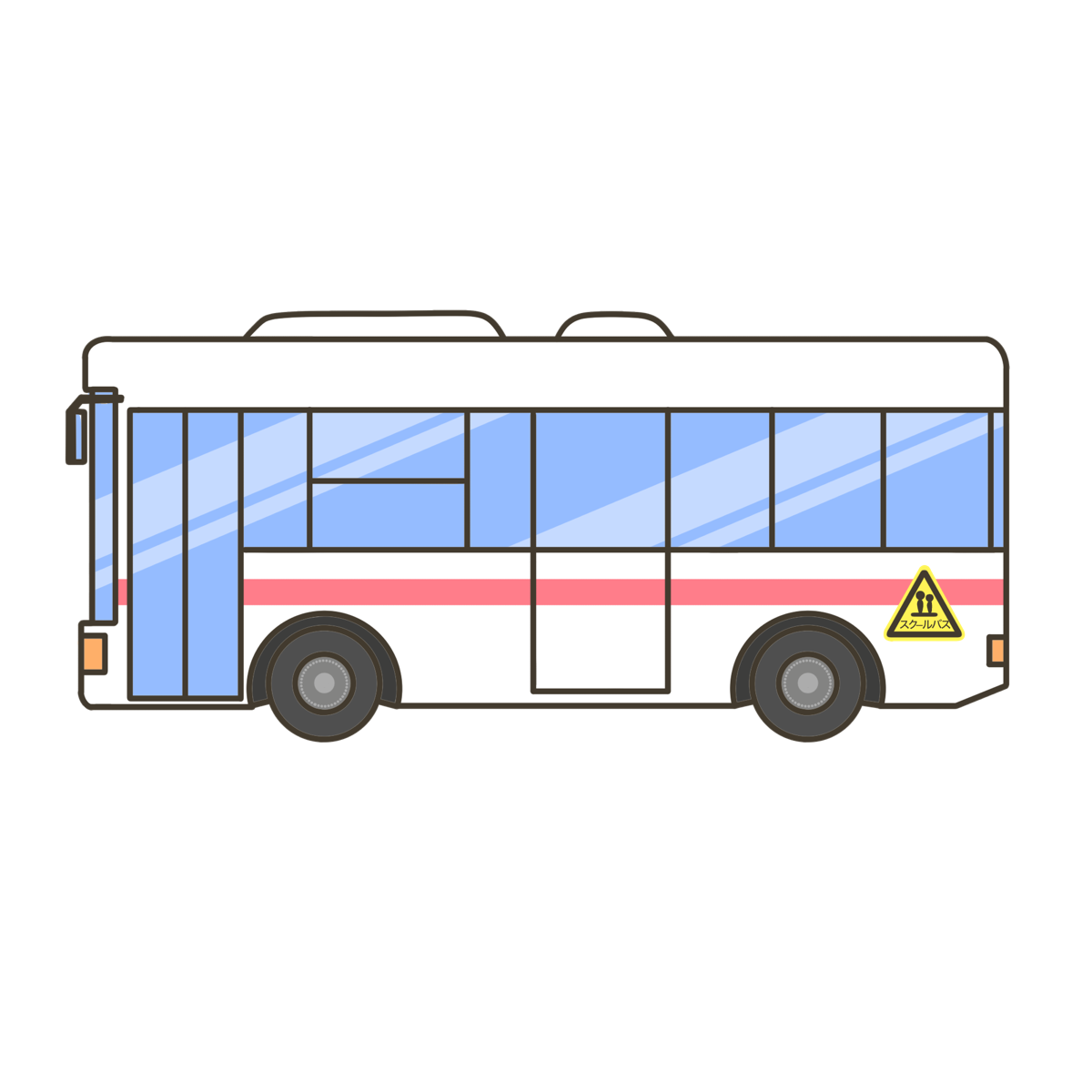 色違いのスクールバスのイラスト素材です。乗り込むバスの色、臨時に乗るバスの色、また使いたいシーンに合わせて、お好みの色を選んでご利用ください。